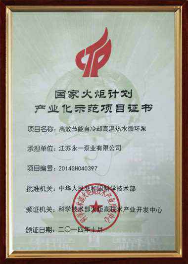 国家火炬计划产业化示范项目证书